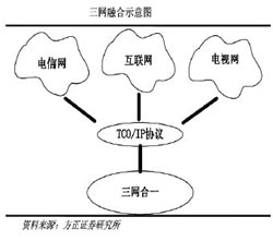 什么是“三網(wǎng)融合”?方正證券在報告中是這么定義的:“三網(wǎng)融合”是指電信網(wǎng)、計算機網(wǎng)和有線電視網(wǎng)三大網(wǎng)絡(luò)通過技術(shù)改造,提供包括語音、數(shù)據(jù)、圖像等綜合多媒體的通信業(yè)務(wù)。 方正證券認為,“三網(wǎng)融合”是業(yè)務(wù)的整合,它不僅繼承了原有的話音、數(shù)據(jù)和視頻業(yè)務(wù),而且通過網(wǎng)絡(luò)的整合,衍生出了更加豐富的增值業(yè)務(wù)類型,如圖文電視、VOIP、視頻郵件和網(wǎng)絡(luò)游戲等,極大地拓展了業(yè)務(wù)提供的范圍;“三網(wǎng)融合”應(yīng)用廣泛,遍及智能交通、環(huán)境保護、政府工作、公共安全、平安家居、智能消防、工業(yè)監(jiān)測、老人護理、個人健康等多個領(lǐng)域。 以后的手機可以看電視、上網(wǎng),電視可以打電話、上網(wǎng),電腦也可以打電話、看電視。三者之間相互交叉,形成你中有我、我中有你的格局。隨著三網(wǎng)時代的到來,國人的生活將會更美好。
