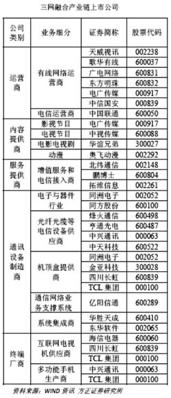 “三網(wǎng)融合”的推進,無疑將拉動一條產(chǎn)業(yè)鏈升級。但是,在東方證券看來,真正利好的是內(nèi)容產(chǎn)業(yè)。 該券商的報告表示,市場可能認為“三網(wǎng)融合”對有線網(wǎng)絡(luò)是特大利好,但在雙向進入的情況下,有線企業(yè)將直面電信企業(yè)的競爭。我國當(dāng)前地域分割的有線網(wǎng)絡(luò)企業(yè)運營能力和資本完全無法與電信企業(yè)相抗衡,“三網(wǎng)融合”真正利好的是內(nèi)容產(chǎn)業(yè)。 因為“三網(wǎng)融合”意味著渠道的更加多元化。對內(nèi)容產(chǎn)業(yè)而言,意味著有更多的分發(fā)渠道,有更多的受眾資源,無論他、她以前是有線網(wǎng)的用戶,還是電信、互聯(lián)網(wǎng)的用戶,內(nèi)容企業(yè)可以有更多的機會與其接觸。就像3G網(wǎng)絡(luò)的推出,眾多的互聯(lián)網(wǎng)企業(yè)可將其平臺移植到3G網(wǎng)絡(luò),增加了受眾人群。 第一創(chuàng)業(yè)則在報告中具體展望說,隨著“三網(wǎng)融合”進程的加快,有線電視公司未來將有望提供語音服務(wù),電信運營商IPTV的發(fā)展也將加快,電信和廣電企業(yè)將既有競爭又有合作。 報告表示,年初的國務(wù)院會議明確了符合條件的廣播電視企業(yè)可以經(jīng)營增值電信業(yè)務(wù)和部分基礎(chǔ)電信業(yè)務(wù)、互聯(lián)網(wǎng)業(yè)務(wù)。原來部分有線電視公司已經(jīng)在提供寬帶上網(wǎng)的互聯(lián)網(wǎng)服務(wù),此次提法意味著未來有線電視公司有希望提供VoIP電話服務(wù)。“三網(wǎng)融合”將使有線電視公司的業(yè)務(wù)范圍大為拓展,增加收入來源。 同時,電信運營商在一些城市已經(jīng)推出了IPTV電視收看業(yè)務(wù),預(yù)計未來IPTV將在更多的城市推廣,但其網(wǎng)絡(luò)基礎(chǔ)和收視質(zhì)量需要有較大的提高才能與有線電視競爭。 廣電企業(yè)有豐富的節(jié)目資源,而電信運營商有市場化的優(yōu)秀營銷能力,未來兩者雖然在進入對方的固有領(lǐng)域時存在一定的競爭,但同時又存在互相合作互補的需要。 方正證券也認為,隨著內(nèi)容運營許可權(quán)的放開,廣電運營商的增長空間將迅速開啟,付費頻道、影視、電視支付、游戲、購物等增值業(yè)務(wù)都可以成為運營商新的利潤增長點。