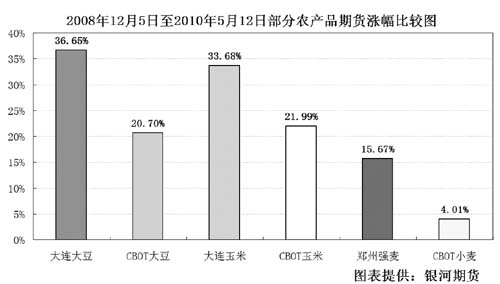 隨著金融危機(jī)對商品的利空逐漸消化,農(nóng)產(chǎn)品期貨價格自2008年12月初以來,走出了震蕩回升的行情;國內(nèi)由于受到國家收儲政策的提振,總體漲幅要大于國際市場。 其中,2008/09年南美大豆大幅減產(chǎn)與中國大豆收儲政策奠定了大豆期貨價格上漲的基調(diào);而國內(nèi)玉米與小麥上漲則主要是受到政策托市的支撐,CBOT玉米與小麥價格主要受商品整體上漲帶動,但國際小麥供應(yīng)一直較為充足,價格漲幅明顯低于其他品種。