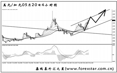 ▲美元兌加元將包含MACD底背離點(diǎn)的下降趨勢(shì)線升破后逐步反彈上行,4小時(shí)圖中客觀趨勢(shì)橫盤。短線匯價(jià)形成一個(gè)小的上升通道,匯價(jià)將沿此通道繼續(xù)上行。首先關(guān)注前波反彈高點(diǎn)1.0740的阻力作用,若升破,美元兌加元還將有更為顯著的上行走勢(shì)。 |