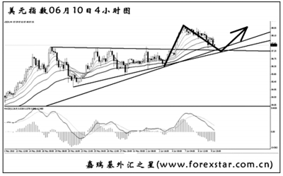 過去的一周,萬眾聚焦的美國5月非農(nóng)報告隆重出爐,數(shù)據(jù)的疲軟,加之匈牙利可能出現(xiàn)主權(quán)債務違約,再度點燃了歐元區(qū)主權(quán)債務危機憂慮,導致全球股市紛紛重挫,風險規(guī)避情緒卷土重來。 美國勞工部上周五公布的數(shù)據(jù)顯示,5月份非農(nóng)就業(yè)人口增加43.1萬人,低于經(jīng)濟學家預期的增加51.3萬人,但仍創(chuàng)下2000年3月份以來最大單月增幅。4月份非農(nóng)就業(yè)人數(shù)增加29萬人,未進行修正。表面上看,盡管美國5月非農(nóng)數(shù)據(jù)低于預期約8萬人,但卻以10年來最快速度大幅增加,并且失業(yè)率由4月的9.8%降至5月9.7%。實質(zhì)上,此次數(shù)據(jù)大增很大程度上是由于美國政府因人口調(diào)查而招聘了41.1萬名臨時人員,而私營部門就業(yè)人口僅增加4.1萬人(4月增長21.8萬人),導致多數(shù)市場人士認為該數(shù)據(jù)十分糟糕,并因此歐美股市受到重挫,市場避險情緒急劇升溫。總體來說,非農(nóng)數(shù)據(jù)令人失望,民間就業(yè)遠低于預期。但有市場人士并不認為這個數(shù)字就意味著就業(yè)市場的復蘇已經(jīng)停滯,其表明的是,就業(yè)市場恢復的步伐要慢于某些樂觀預期。若不考慮5月份非農(nóng)就業(yè)數(shù)據(jù)中人口普查相關(guān)的失真因素,則這份報告還是非常樂觀的,但如果考慮了這個因素,實際的結(jié)果相當令人失望。即使失業(yè)率下降也不值得慶賀,因為下降的原因并不令人滿意。 美元指數(shù)現(xiàn)已突破了圖中三角形上升中繼的上沿,主趨勢延續(xù)。從空間上看,上方美元指數(shù)的重要阻力在去年3月的高點89.65,預計美元指數(shù)順利突破此位置有一定難度。4小時圖發(fā)生了一連串的MACD頂背離信號,但包含背離點的趨勢線尚未被跌破,短線關(guān)注此趨勢線87.25的支撐力度,后市美元指數(shù)繼續(xù)上沖的希望較大。 未來一周需要重點關(guān)注的財經(jīng)數(shù)據(jù)及事件包括:6月11日,美國公布5月政府預算(前值-826.9億美元)、5月零售銷售月率(前值+0.4%)、6月密歇根大學消費者信心指數(shù)初值(前值73.6)、4月商業(yè)庫存月率(前值+0.4%),英國公布4月工業(yè)產(chǎn)出月率及年率(前值2.0%、2.0%);6月14日,歐元區(qū)公布4月工業(yè)產(chǎn)出月率及年率(前值+1.3%、+6.9%);6月15日,日本央行公布利率決議、澳聯(lián)儲公布6月貨幣政策會議記錄、英國公布5月消費者物價指數(shù)月率及年率(前值+0.6%、+3.7%)、德國公布6月ZEW經(jīng)濟景氣和現(xiàn)況指數(shù)(前值45.8、-21.6)、美國公布6月紐約聯(lián)儲制造業(yè)指數(shù)(前值19.11)以及4月長期、國際資本凈流入,前值1405億美元、105億美元;6月16日,日本公布4月第三產(chǎn)業(yè)活動指數(shù)月率(前值-3.0%)、美國公布5月生產(chǎn)者物價指數(shù)月率及年率(前值-0.1%、+5.5%)、5月新屋開工年化月率(前值+5.8%)、5月工業(yè)產(chǎn)出月率(前值+0.8%);6月17日,美國公布5月消費者物價指數(shù)月率及年率(前值-0.1%、+2.2%)、5月諮商會領(lǐng)先指標(前值109.3)。