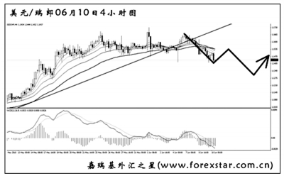 ▲美元兌瑞郎將4小時(shí)圖的上升趨勢(shì)線跌破,此前一連串的MACD頂背離信號(hào)發(fā)揮了一定的效果,目前有階段性筑頂成功的跡象,但目前下結(jié)論還為時(shí)尚早。短線的強(qiáng)動(dòng)能交替節(jié)奏頻繁,操作有一定的難度。此波美元兌瑞郎有望向前方道氏點(diǎn)1.1265挺進(jìn),但跌破的希望不大。