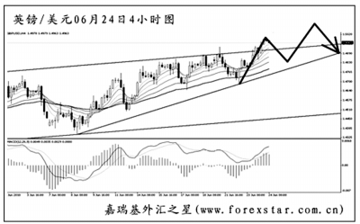 ▲英鎊兌美元運(yùn)行到了大級(jí)別旗形中繼的上沿,并已將上沿小幅升破。目前還不能確定旗形中繼失敗,需重點(diǎn)關(guān)注1.5055一線的阻力,若英鎊將此位置突破,則中線的下跌將告一段落,后市轉(zhuǎn)為看漲思路。預(yù)計(jì)短線匯價(jià)還將有一波回落,考驗(yàn)趨勢(shì)線的作用。