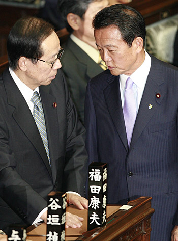 本報東京電 日本國會眾議院議長河野洋平24日在眾議院全體會議上宣布,執(zhí)政的自民黨新總裁麻生太郎當選首相。麻生太郎24日晚宣布了內(nèi)閣成員名單。 在內(nèi)政方面,麻生主張以強有力的積極財政政策應對當前的經(jīng)濟不景氣,為此,他不惜放棄此前日本政府提出的在2011年度實現(xiàn)基礎(chǔ)財政收支盈余的目標。 圖為麻生太郎(右)與前首相福田康夫在會場交談。(新華社記者 任正來 攝)