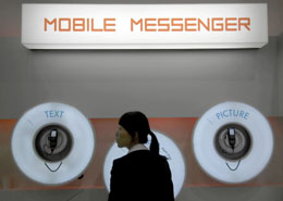 參觀者體驗(yàn)最新的手機(jī)短信系統(tǒng)。 本報(bào)記者 公磊 攝 |