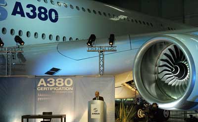 12日,EADS法方聯(lián)席首席執(zhí)行官兼空客首席執(zhí)行官加盧瓦在法國南部圖盧茲舉行的空客A380客機(jī)飛行執(zhí)照授予儀式上致詞。當(dāng)日,歐洲航空安全局和美國聯(lián)邦航空局正式授予空客A380客機(jī)飛行執(zhí)照,為客機(jī)明年開始交貨清除了最后一道技術(shù)關(guān)口。