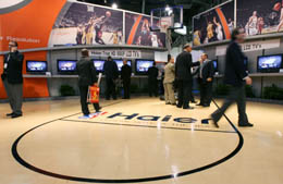 在海爾300多平方米的展位上,數(shù)臺超大屏幕高清電視上播放的NBA比賽畫面,動感十足,吸引了許多人的目光。等候海爾展區(qū)NBA巨星德雷克斯勒簽名的人排起了長隊。