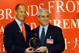 在美國(guó)拉斯維加斯舉行的國(guó)際消費(fèi)電子展上,由國(guó)際數(shù)據(jù)集團(tuán)、瑞德商業(yè)咨詢集團(tuán)、中國(guó)電子商會(huì)主辦,美國(guó)市場(chǎng)調(diào)查及預(yù)測(cè)公司協(xié)辦的中國(guó)十大消費(fèi)電子領(lǐng)先品牌評(píng)選活動(dòng)揭曉,海爾位居中國(guó)十大消費(fèi)電子領(lǐng)先品牌榜首,充分體現(xiàn)了海爾全球化戰(zhàn)略在國(guó)際上的影響力。圖為海爾美國(guó)貿(mào)易公司總經(jīng)理邁克先生(右)代表領(lǐng)獎(jiǎng)。吳明