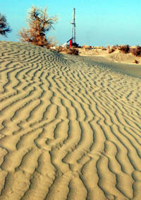 新疆塔里木哈得油田2006年已生產(chǎn)原油200萬噸,成為我國第一個年產(chǎn)200萬噸原油的沙漠油田。圖為位于新疆塔克拉瑪干沙漠腹地的哈得油田一角。