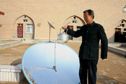 近年來(lái),在國(guó)家農(nóng)業(yè)部、發(fā)改委的大力支持下,甘肅省先后實(shí)施了“生態(tài)家園富民計(jì)劃”、“農(nóng)村小型公益設(shè)施補(bǔ)助資金農(nóng)村能源”和“農(nóng)村沼氣利用國(guó)債”等一系列新能源利用和生態(tài)保護(hù)綜合項(xiàng)目。截至目前,甘肅省農(nóng)民使用太陽(yáng)灶達(dá)超過(guò)50萬(wàn)臺(tái),居全國(guó)第一位;建成農(nóng)村戶用沼氣池12.3萬(wàn)個(gè),相當(dāng)于每年可減少砍伐林地30萬(wàn)畝,節(jié)約煤炭10萬(wàn)余噸。圖為甘肅省慶陽(yáng)市華池縣悅樂鎮(zhèn)新堡子村農(nóng)民龐平剛正在用太陽(yáng)能熱水器燒開水。 |