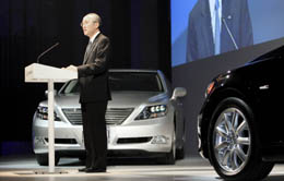5月17日,日本豐田汽車公司旗下豪華車品牌雷克薩斯Lexus在東京舉行新車發(fā)布會,一舉推出兩款“代表Lexus巔峰之作”的混合動力豪華轎車LS600h/LS600hL。兩款新車裝備5.0升,V8混合動力發(fā)動機,使用鎳氫燃料電池和汽油混合動力,全時四驅驅動。圖為豐田總裁渡邊捷昭(Katsuaki Watanabe)發(fā)布會上推介新車。