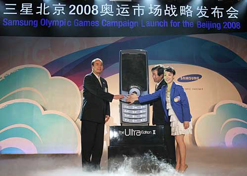 | 2007年6月6日,奧運(yùn)會(huì)無線通信領(lǐng)域全球合作伙伴三星電子發(fā)布了北京2008年奧運(yùn)會(huì)市場戰(zhàn)略,強(qiáng)勢推出三星E848、P318和U308三款?yuàn)W運(yùn)手機(jī),同時(shí)宣布奧運(yùn)會(huì)體操冠軍劉璇成為三星奧運(yùn)形象大使。劉璇將代言三星北京2008年奧運(yùn)會(huì)所有市場營銷活動(dòng)。 | |