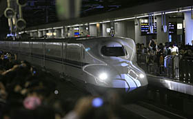 “希望”號第99次列車7月1日清晨6點(diǎn)駛離東京品川車站,踏上了前往南部博多車站的旅途。這標(biāo)志著日本N700系列新一代新干線列車正式投入運(yùn)營。 清晨5點(diǎn)前后,站臺邊就擠滿了各路記者和新干線迷。5點(diǎn)45分,整裝待發(fā)的“希望”號99次列車在人們的翹首以待中緩緩駛?cè)?3號站臺。N700系列新干線列車通體呈白色,車頭采用流線雙翼形。每節(jié)車廂長25米,寬3.3米,高3.6米,一個編組總重量達(dá)715噸。列車采用2.5萬伏60赫茲交流供電方式,一個編組的輸出功率為17080千瓦,設(shè)計(jì)最高時速340公里,額定載客人數(shù)1323人。 N700系列新干線列車是日本東海旅客鐵道公司和西日本旅客鐵道公司以700系列列車為基礎(chǔ)開發(fā)的升級版本,在快捷、舒適、環(huán)境性能和節(jié)能等方面實(shí)現(xiàn)了全面提升。由于采用了新設(shè)計(jì)和新型自動控制系統(tǒng),這種列車在平坦路軌上從靜止加速到每小時270公里約需要180秒,比700型列車如此加速的時間縮短40%,在彎道行駛的最高速度可達(dá)每小時270公里。N700型列車的所有車廂都配備了高性能的半主動減振器,使得剎車時車廂更加平穩(wěn)。車廂內(nèi)還有空調(diào)換氣系統(tǒng),更符合人形體特點(diǎn)的座椅以及多媒體彩色信息提示裝置等。在節(jié)能方面,N700型列車采用了車頭兩側(cè)“雙翼”設(shè)計(jì)以減少行駛中的空氣阻力,并且采用新的材料和制造工藝以減輕車體重量,從而使列車更加節(jié)能。 據(jù)介紹,7月1日投入運(yùn)營的N700系列新干線列車共有8輛,它們?nèi)吭跂|海道(東京至新大阪)和山陽(新大阪至博多)運(yùn)行。今后這一系列的列車將逐漸替換目前的300、500系列,成為新一代新干線的主力車型。