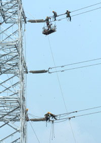 天津電力建設(shè)史上規(guī)模最大、線路最長的電網(wǎng)工程——東麗500千伏輸變電工程,已進(jìn)入后期施工階段。圖為施工人員在酷暑下進(jìn)行放線施工。