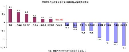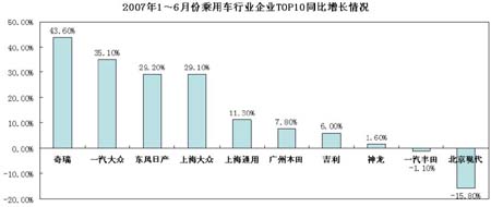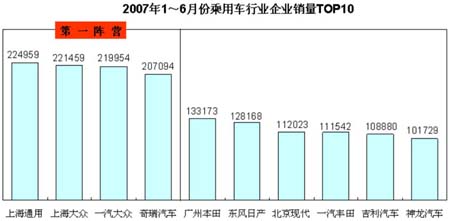 2007年上半年,從乘用車(chē)行業(yè)十五強(qiáng)的市場(chǎng)占有率來(lái)看,各企業(yè)的排名正好是“七上八下”,其中,“七上”的企業(yè)根據(jù)業(yè)績(jī)排名分別為:奇瑞、一汽海南、東風(fēng)日產(chǎn)、一汽大眾、上海大眾、長(zhǎng)安福特和廣州豐田;“八下”的企業(yè)分別是:吉利、神龍、天津一汽、悅達(dá)起亞、上海通用、廣州本田、一汽豐田和北京現(xiàn)代。 十五強(qiáng)企業(yè)的“七上八下”也使上半年車(chē)市平穩(wěn)發(fā)展的環(huán)境下出現(xiàn)了“幾家歡喜幾家愁”的局面。