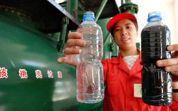 近年來,中國石油長慶采油三廠紅井子作業(yè)區(qū)利用核桃殼污水處理裝置,將開采原油中的水經(jīng)過分離、處理,并在注水開采中代替地下水回注到地層中,既節(jié)約成本,又減少污水排放。圖為長慶油田采油三場紅井子作業(yè)區(qū)工作人員在展示污水處理前后的比較。