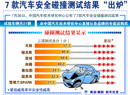 中國汽車技術(shù)研究中心近日公布了七款汽車安全碰撞測試結(jié)果,并公開展示了參與碰撞的21輛樣車。 參與碰撞測試的7款汽車是:東風(fēng)悅達起亞生產(chǎn)的起亞賽拉圖轎車、一汽轎車生產(chǎn)的紅旗牌奔騰轎車、一汽海馬生產(chǎn)的海馬福美來轎車、長安福特馬自達生產(chǎn)的福特福克斯轎車、東風(fēng)本田生產(chǎn)的思域轎車、上汽通用五菱生產(chǎn)的雪佛蘭SPARK轎車、東風(fēng)日產(chǎn)生產(chǎn)的天籟轎車。這七個車型共21輛試驗車輛,由中國汽車技術(shù)研究中心直接從各品牌的專賣店購買,累計花費資金279.5萬元。 碰撞測試結(jié)果顯示,“天籟”與“?怂埂痹谌棞y試中均得到較高分?jǐn)?shù),分別以47.1分和45.4分的總分被評定為5星級車。而“雪佛蘭SPARK”在7款車中得分最低,僅27.2分,被評為2星級車。 另外,“思域”得分44.4分,與得分40.2分的“奔騰”一樣,被評定4星級車;“賽拉圖”和“福美來”則分別以33.1分和32.3分,被評為3星級車。 中國汽車技術(shù)研究中心主任、C-NCAP管理中心主任趙航說,這七款車按照中國新車評價規(guī)程(C-NCAP)的要求,先后進行了三項碰撞測試:一是正面100%重疊性壁障碰撞試驗,時速不低于50公里;二是正面40%重疊可變形壁障碰撞試驗,時速不低于56公里;三是可變形移動壁障側(cè)面碰撞試驗,時速不低于50公里。測試總分最高得分為51分,根據(jù)得分情況分為1到5+共六個星級。 趙航說,評價結(jié)果通過100多個通道的精密測試數(shù)據(jù)、高速攝像資料和試驗前后對車輛特定部位的三維測量,再由經(jīng)驗豐富的專業(yè)人員綜合分析計算完成。從最新公布的七個車型的星級評價結(jié)果可以看出,有的產(chǎn)品技術(shù)成熟、性能優(yōu)異,也有的產(chǎn)品車身結(jié)構(gòu)還有待改進,碰撞保護性能不足?傮w看來,經(jīng)濟型乘用車仍然缺乏更出色的表現(xiàn),安全性能還有待進一步提升,產(chǎn)品制造質(zhì)量也需要更加重視。 中國汽車技術(shù)研究中心是我國首個對汽車進行公開的安全碰撞測試的第三方機構(gòu),自去年7月以來,該中心已對23個車型、69輛汽車進行了安全碰撞試驗。 C-NCAP的具體實施細則是中國汽車技術(shù)研究中心在多年研究和分析國外權(quán)威的新車評價規(guī)程(NCAP)的基礎(chǔ)上,結(jié)合我國的汽車標(biāo)準(zhǔn)法規(guī)、道路交通實際情況和車型特征制定而成的。其技術(shù)要求不僅明顯高于我國現(xiàn)有國家標(biāo)準(zhǔn)對汽車產(chǎn)品碰撞安全性能的規(guī)定,更是綜合性的系統(tǒng)評價,能夠客觀全面地反映汽車產(chǎn)品在碰撞安全性能方面的技術(shù)水平。 為保證測試的獨立、客觀、公正,中國汽車技術(shù)研究中心為C-NCAP的運行建立了完整的管理體系并給予充分的資金保障。所有車輛全部從市場直接購得,不接受廠家直接送車,采購和試驗過程對媒體全程公開。