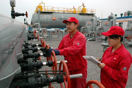 中國(guó)石油長(zhǎng)慶油田公司石油勘探工作又獲重大突破,位于鄂爾多斯盆地西南部的西峰油田,截至2006年底三級(jí)儲(chǔ)量已達(dá)到5.68億噸。圖為中國(guó)石油長(zhǎng)慶油田公司第二采油廠兩名職工在西一聯(lián)合站來(lái)油總機(jī)關(guān)切換來(lái)油進(jìn)站流程。 |