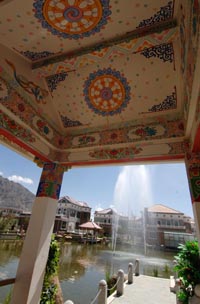 近年來,隨著西藏經(jīng)濟社會的飛速發(fā)展和青藏鐵路的開通,拉薩房地產(chǎn)業(yè)蓬勃發(fā)展。2003年拉薩第一個現(xiàn)代化樓盤的成功開發(fā)到現(xiàn)在短短幾年,拉薩房地產(chǎn)發(fā)展迅猛,有四十多家國有民營企業(yè)注冊拉薩房地產(chǎn)開發(fā),年均開發(fā)項目總面積超過50萬平方米。目前,拉薩房地產(chǎn)呈現(xiàn)出由傳統(tǒng)的獨棟藏式家居到公寓樓的轉(zhuǎn)型;開發(fā)重心由市中心移向郊區(qū);購房居住和投資置業(yè)并存等特點。圖藏式廊亭映襯下的水景住宅區(qū)。 |