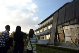 山東德州學(xué)院數(shù)學(xué)系的學(xué)生在太陽能博物科技館參觀“零排放別墅”。該別墅的電力完全依靠太陽能供給,同時(shí)能夠吸收太陽熱量,把剩余熱量儲(chǔ)存起來供采暖期使用。