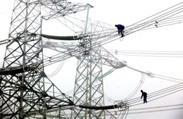 位于重慶市綦江縣的隆盛變電站目前已基本建成,本月底即將投入運(yùn)行,這標(biāo)志著重慶提前三年完成了500千伏“日”字形環(huán)網(wǎng)建設(shè),重慶電力供應(yīng)緊張局面將得到緩解。圖為電業(yè)工人在高空作業(yè)。