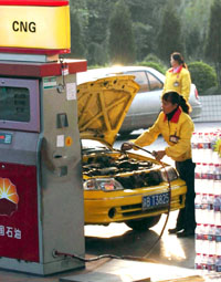 一位工人正在為一輛出租車加氣。記者從重慶市政府辦公廳獲悉,重慶壓縮天然氣(CNG)汽車保有量目前已達(dá)4萬輛,列全國(guó)城市之首。