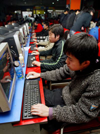 來自中國電信上海公司的最新數(shù)據(jù)顯示,上海的寬帶用戶已達300萬戶,平均每六人就擁有一根寬帶,成為全國寬帶用戶數(shù)量最多的城市。圖為幾名上海大學(xué)生在網(wǎng)吧內(nèi)用裝有寬帶的電腦上網(wǎng)。