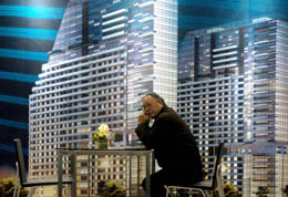 近日舉行的杭州不動(dòng)產(chǎn)交易會(huì)上冷冷清清。圖為一位來(lái)逛杭州不動(dòng)產(chǎn)交易會(huì)的市民在樓盤(pán)廣告前小憩。本報(bào)記者:王定昶 攝 |