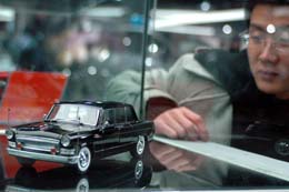 中國長春汽車文化園展銷中心正式“開門迎客”,它是繼汽車博物館之后,中國長春汽車文化園中第二個向社會開放的項目,該中心總建筑面積約5萬平方米,可以同時展賣上千輛商務(wù)及家庭用車,規(guī)模在東北地區(qū)首屈一指。圖為一位參觀者在欣賞展銷中心內(nèi)的紅旗車模型。