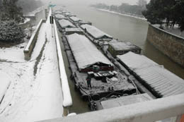 在近期大雪對運(yùn)輸造成影響的情況下,江蘇揚(yáng)州交通部門通過開辟水上“綠色通道”、加大巡航力度等措施,對途經(jīng)京杭運(yùn)河揚(yáng)州段的電煤運(yùn)輸船隊(duì)實(shí)行24小時(shí)不間斷放行,力保蘇南及沿江電廠的用煤需求。圖為運(yùn)輸電煤的船隊(duì)通過京杭運(yùn)河揚(yáng)州邵伯船閘。 |