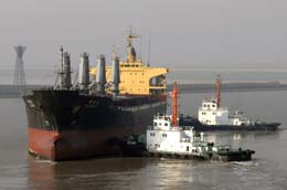 在河北黃驊港,一艘貨輪在拖輪的輔助下靠岸。 | 南方大部地區(qū)持續(xù)不斷的雪災(zāi)、冰災(zāi),使得電煤供應(yīng)成為重大難題。而在北煤南運(yùn)的這一鏈條中,地處冀東的黃驊港擔(dān)負(fù)著東南5省1市電煤運(yùn)輸重任。由于特殊的地理位置,黃驊港形成了我國(guó)最長(zhǎng)的人工單向航道,自然災(zāi)害多,安全隱患突出,這也使得這一能源港“牽一發(fā)而動(dòng)全身”。 作為主管轄區(qū)海上交通安全的河北省黃驊海事局,逐步建立起一整套新型海事安全監(jiān)管新機(jī)制,實(shí)現(xiàn)沿海港口聯(lián)合安全調(diào)度,實(shí)行強(qiáng)制引航和定點(diǎn)護(hù)航,自主研發(fā)對(duì)進(jìn)港船舶和船長(zhǎng)實(shí)施安全評(píng)估的軟件系統(tǒng),量化安全指標(biāo)等。曾經(jīng)在港口開航當(dāng)天就發(fā)生船舶擱淺事故的黃驊港,三年來(lái)實(shí)現(xiàn)了“萬(wàn)船進(jìn)出港,無(wú)一艘擱淺”的目標(biāo),確保了北煤南運(yùn)安全無(wú)虞。