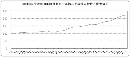 2008年1月,北京中高檔二手房成交價格為13408.3元/平方米,中原(北京)領(lǐng)先指數(shù)為222點,環(huán)比上月上漲1.22%,與2007年12月價格增幅相比仍呈趨緩走勢。同時,北京中高檔二手房買賣成交量環(huán)比上月下浮15.65%。由此可見,北京中高檔二手房市場仍持續(xù)價升量降現(xiàn)象。