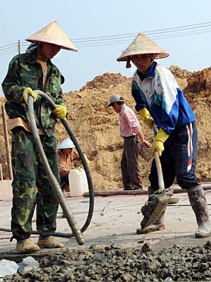 2008年3月11日,廣西欽州市的建筑工人正在給一在建農(nóng)村公路澆灌混凝土。 2008年廣西計(jì)劃建設(shè)農(nóng)村公路約7000公里,新增73個(gè)鄉(xiāng)鎮(zhèn)通油路,基本實(shí)現(xiàn)廣西所有鄉(xiāng)鎮(zhèn)通油路,新增500個(gè)建制村通公路、250個(gè)建制村通油路。目前,廣西已實(shí)現(xiàn)了95%的縣通二級(jí)公路,基本實(shí)現(xiàn)所有少數(shù)民族鄉(xiāng)和91%的鄉(xiāng)鎮(zhèn)通油路,81%的行政村通公路,農(nóng)村地區(qū)交通條件得到了進(jìn)一步改善。 | |