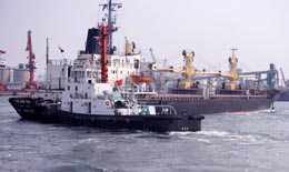 秦皇島港是一個年煤炭吞吐量超過2億噸的能源輸出港,占全國沿海港口煤炭下水量的近50%。雜貨集裝箱通過能力在全國港口中卻僅處于第26位。日前,秦皇島港務(wù)集團正謀劃在鞏固北煤南運主樞紐港基礎(chǔ)上發(fā)展雜貨集裝箱業(yè)務(wù),爭取到2010年,使秦皇島港年集裝箱吞吐量達(dá)100萬標(biāo)箱。圖為秦皇島港的一艘拖輪在幫助一艘大型輪船靠岸。 |