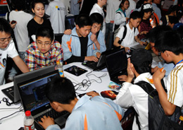 日前,第四屆中國國際動漫產(chǎn)業(yè)博覽會在杭州開幕。在看似簡單的電子游戲、動畫片等動漫產(chǎn)業(yè)終端產(chǎn)品的背后,是一整條包括科技研發(fā)、制作、銷售和動漫形象衍生產(chǎn)品開發(fā)的產(chǎn)業(yè)鏈,據(jù)估計,中國動漫游戲產(chǎn)業(yè)年總產(chǎn)值在180億元左右。圖為一些學(xué)生圍聚在電腦前嘗試新的電腦游戲。 |