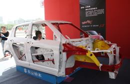 5月24日,中國汽車安全主題巡展在長春文化廣場舉行,展會上各家廠商分別宣傳演示了自己公司產(chǎn)品在安全方面的特點(diǎn)和優(yōu)勢。圖為一家廠商在展示車骨架的安全設(shè)計(jì)。