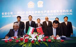 5月30日,長(zhǎng)安汽車(chē)與伊朗PIDF集團(tuán)正式在重慶長(zhǎng)都假日酒店簽署雙方合作在伊朗生產(chǎn)長(zhǎng)安奔奔的協(xié)議。該協(xié)議內(nèi)容包括技術(shù)轉(zhuǎn)讓及零部件供應(yīng)等一攬子合同,初期生產(chǎn)線建設(shè)規(guī)模為5萬(wàn)輛,并最終達(dá)到25萬(wàn)輛年產(chǎn)量的規(guī)模。 按照雙方達(dá)成的協(xié)議,今年年底,長(zhǎng)安將全部完成在伊朗建線的設(shè)備準(zhǔn)備,從明年上半年開(kāi)始正式投產(chǎn)。
