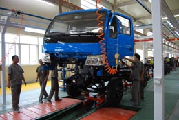 7月13日,動(dòng)工僅一年的廣西福達(dá)車(chē)輛有限公司在北海市工業(yè)園實(shí)現(xiàn)投產(chǎn),首批汽車(chē)順利下線。這個(gè)年產(chǎn)兩萬(wàn)臺(tái)低速汽車(chē)(即農(nóng)用汽車(chē))和載重運(yùn)輸車(chē)、搶險(xiǎn)車(chē)、垃圾壓縮車(chē)等專(zhuān)用汽車(chē)的企業(yè),填補(bǔ)了北部灣地區(qū)汽車(chē)生產(chǎn)的空白。圖為幾名工人正在安裝汽車(chē)駕駛艙。 |