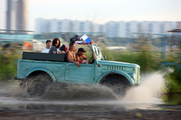 7月12日,在俄羅斯首都莫斯科前圖希諾機(jī)場(Airport Tushino),人們開著吉普車從水中駛過。當(dāng)日,2008汽車風(fēng)情展(Autoexotic 2008)莫斯科站正式對公眾開放,汽車愛好者們開著自己的愛車聚集在這里,交流車技和改裝、保養(yǎng)車輛的知識,分享對汽車和駕駛的熱愛之情,觀看表演品嘗美食,享受夏日時(shí)光。