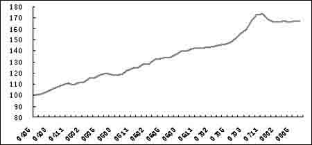 2008年6月,中原(廣州)領(lǐng)先指數(shù)為167.3,環(huán)比下降0.1個(gè)百分點(diǎn);成交量比上月的小高潮有明顯回落,整體成交價(jià)小幅下調(diào)。從半年的趨勢(shì)來(lái)看,廣州二手房?jī)r(jià)格走勢(shì)以平穩(wěn)為主。