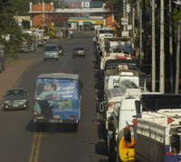 國際油價的大幅上漲使得石油嚴重依賴進口的巴拉圭面臨嚴重的能源危機,巴拉圭石油公司(Petropar)至今仍拖欠外國石油公司3.2億美元的費用,國內(nèi)成品油供應(yīng)嚴重不足。近30%的公交車和出租車因為缺油無法工作,正在收割季節(jié)的農(nóng)業(yè)部門也因為燃油供應(yīng)不足蒙受巨大損失。圖為7月15日,巴拉圭首都各加油站的運油車在巴拉圭石油公司大門前排起長隊,等待加油。