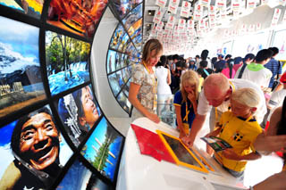 奧運(yùn)催生了北京新的商圈,奧林匹克中心區(qū)周圍的商業(yè)物業(yè)面臨新的發(fā)展機(jī)遇。圖為游客正在奧林匹克中心區(qū)的一個(gè)贊助商展館內(nèi)參觀。