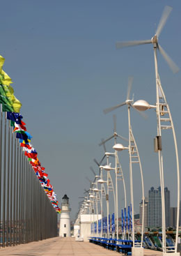 青島奧帆中心在場(chǎng)館建設(shè)中倡導(dǎo)“科技奧運(yùn)、綠色奧運(yùn)”的理念,大量利用太陽能、風(fēng)能等清潔能源。圖為奧帆中心主防波堤建設(shè)安裝了41盞風(fēng)能燈。新華社記者:宋振平