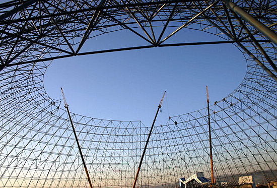 近日,呼和浩特鐵路局包頭古城灣萬噸環(huán)保煤炭裝車基地基本建成并試運行。圖為正在安裝的古城灣煤炭裝車基地3號儲煤倉。