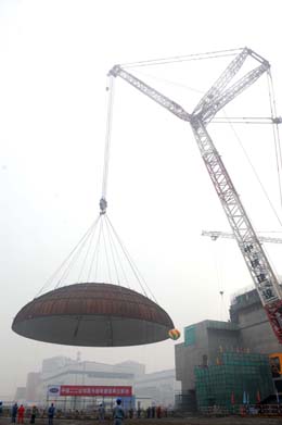 | 秦山核電4號(hào)機(jī)組反應(yīng)堆安全殼穹頂?shù)跹b成功 |