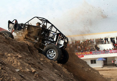 11月8日,車手駕駛攀巖車進(jìn)行爬坡演示。當(dāng)日,為期兩天的河北省第六屆汽車場(chǎng)地賽暨邯鄲市汽車運(yùn)動(dòng)文化節(jié)在邯鄲拉開帷幕。邯鄲生產(chǎn)的一款時(shí)速為60公里,適用于沙漠、山地、丘陵等復(fù)雜地形的野外攀巖車吸引了觀眾目光,車手駕駛它進(jìn)行了精彩的表演。