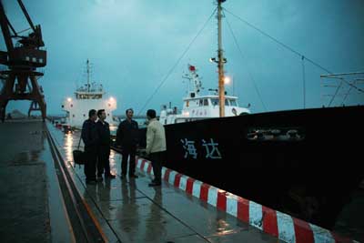 圖為青島海關(guān)緝私局偵查員在被抓獲的走私船邊研究案情。