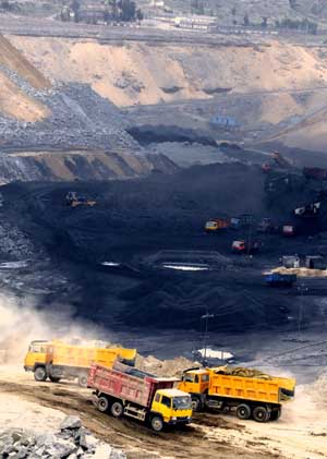 近年來(lái),內(nèi)蒙古煤炭產(chǎn)業(yè)發(fā)展迅速。2008年前三季度,內(nèi)蒙古規(guī)模以上企業(yè)原煤產(chǎn)量達(dá)3.42億噸,同比增長(zhǎng)28.6%。目前,內(nèi)蒙古原煤年生產(chǎn)能力已達(dá)到4.55億噸,成為僅次于山西省的產(chǎn)煤大區(qū)。圖為內(nèi)蒙古鄂爾多斯高原一處正在新建的特大型露天煤田。 |