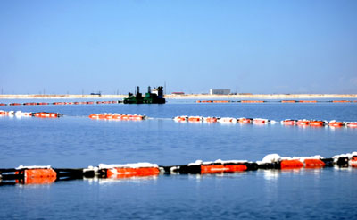 一艘采鹽船在中國最大的鹽湖青海西部柴達木盆地察爾汗鹽湖作業(yè)。新華社記者:嘎瑪