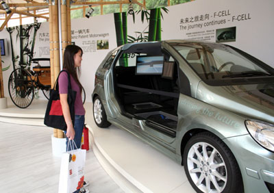 圖為德國(guó)戴姆勒公司的展館帶參觀者回顧了汽車的發(fā)展史,也展望了汽車發(fā)展的未來(lái)。展館內(nèi)展出了世界上第一輛汽車的模型,它的旁邊就是一款能夠“零排放行駛”的梅賽德斯-奔馳B級(jí)燃料電池車。杜鵑